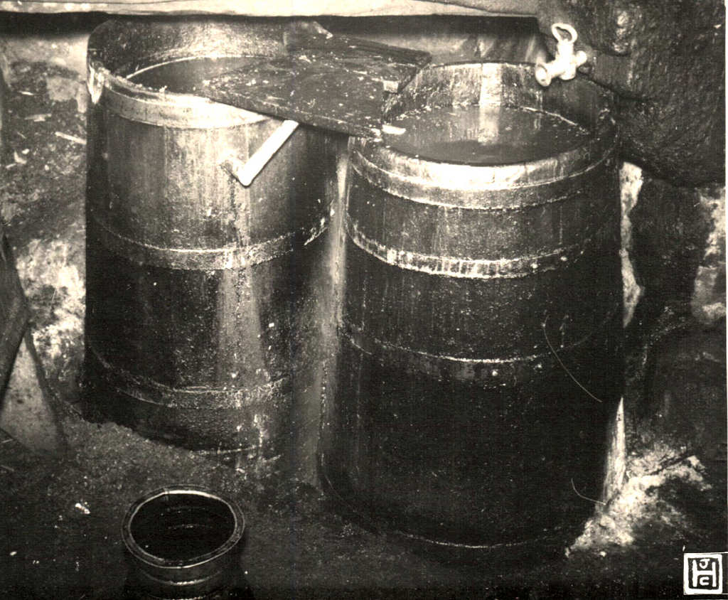 Figura 143: Sertã e pote de decantação do lagar de Cadeado, freg. Santa Marinha do Zêzere, P. 54, conc. Baião, dist. Porto, no momento da prensagem. À esquerda, a caldeira.