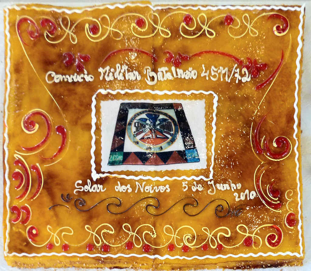 Noivos.                                                                  | O bolo tradicional com o emblema do Batalhão.