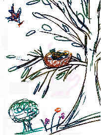 - Aconchega-os nas tuas asas, Alícia, que devem estar cheiinhos de frio! Eu vou procurar sementes de flores, que são mais pequenas, para lhes dar nos bicos; precisam de se alimentar! E lá foi, todo feliz! Alícia ficou ali a piar baixinho, embalando os filhotes. E todos os dias faziam as mesmas coisas, com tanto carinho, que os pequenos pássaros foram crescendo, as penas nasceram e eles até já iam sabendo fazer: piu... piu... Só faltava mesmo voar! Piá, Vogas e Tugi, estes eram os nomes dos três filhotes mais velhos, estavam ansiosos por voar até ao chão, para sentirem a terra nas patas. Só Pituças, o mais novo, não tinha pressa nenhuma. E pensava lá consigo: - Não quero voar! Estou tão bem aqui no ninho! Os meus pais trazem-me comida e água… Não quero voar! Tenho medo! E ali ia ficando, com os olhos fechados, cheio de preguiça. Ora, certo dia, logo de manhãzinha, os passarinhos-papás disseram aos seus filhos: