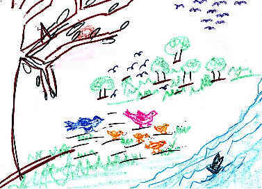Estavam agora todos juntos, no chão, muito contentes e iam procurar comida; depois iriam voar até à margem do rio, para ouvir o suave cântico da água e espreitar os peixinhos vermelhos que nadavam felizes. |