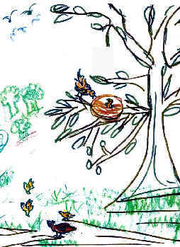 Estavam agora todos juntos, no chão, muito contentes e iam procurar comida; depois iriam voar até à margem do rio, para ouvir o suave cântico da água e espreitar os peixinhos vermelhos que nadavam felizes.