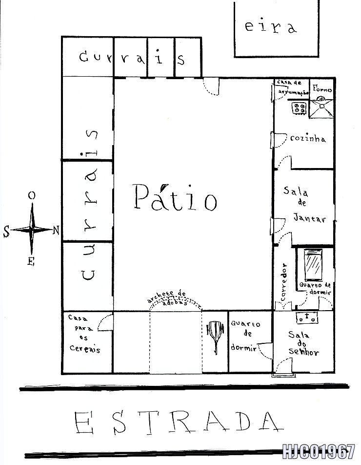 Neste caso, os dados invertem-se; a parte destinada à residência passa para o lado dos currais (inverta-se, para melhor seguir o raciocínio, a planta da figura 25, de maneira que a eira fique voltada para nascente), continuando a residência para norte e as portas da cozinha e sala de jantar para sul.
