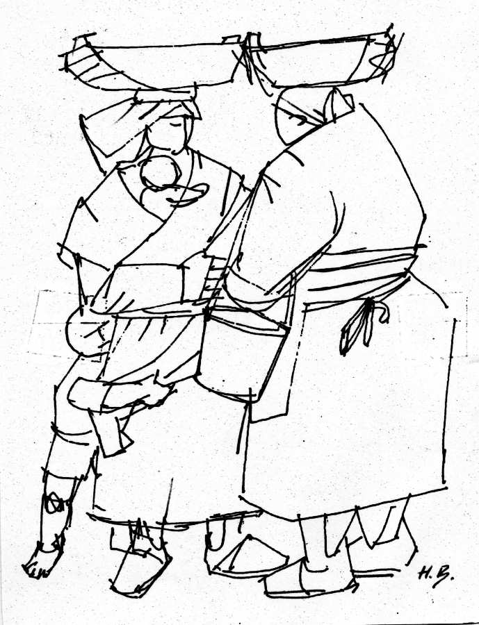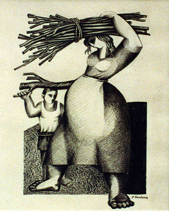 “Mãe e filho carregando lenha”, desenho a lápis |