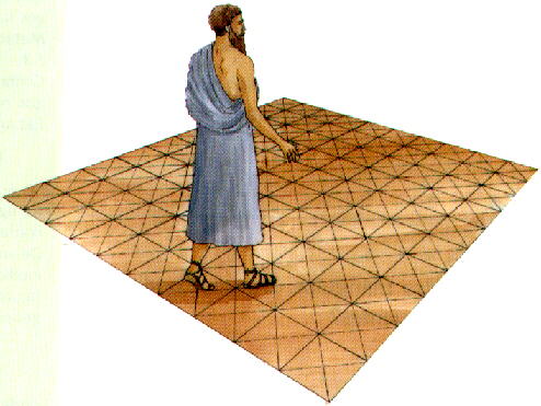 A caminho de Siracusa, Dizia Pitágoras aos netos: O quadrado da hipotenusa é igual à soma dos quadrados dos catetos. DA LENDA AO TEOREMA DE PITÁGORAS Refere uma lenda que, certo dia, passeando Pitágoras sobre um pavimento ladrilhado, a sua atenção foi alertada pelo desenho. Os ladrilhos eram quadrados e estes estavam decompostos pelas suas diagonais em triângulos congruentes.