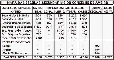 6º — A solução será, portanto, não desactivar uma escola, cujo valor histórico e papel no ensino é importante, mas construir mais edifícios escolares do que os previstos, em zonas diversificadas da cidade e estrategicamente situadas, de modo a comportarem os 3616 alunos excedentes, se quisermos que as escolas de Aveiro trabalhem de acordo com as suas reais capacidades e de maneira a obterem um ensino cada vez mais eficiente, em sintonia com as novas normas educativas comunitárias.