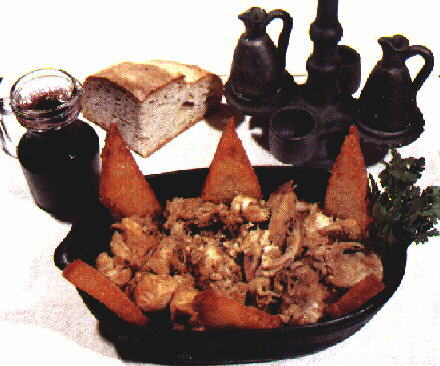 Limpa o coelho e corta-o aos bocados. Tempera-o com sal, pimenta e piripiri e coloca-o num tacho com a cebola e os dentes de alho às rodelas. Junta-lhe todos os outros ingredientes e leva-os ao lume com o tacho tapado. Quando estiver pronto serve-o num prato coberto, com pão frito no fundo. |