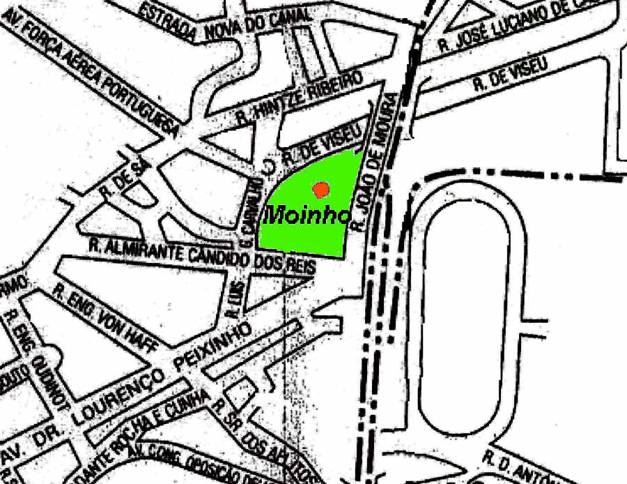 Localização do moinho. Clicar para ampliar.Se consultarmos o Tombo da Vila de Esgueira, na documentação do Mosteiro do Lorvão, guardada no Arquivo da Universidade de Coimbra, mandado fazer pela abadessa daquele Mosteiro e elaborado pelo Doutor Francisco de Bastos Monteiro, nos princípios do séc. XVIII, veremos que o mesmo moinho nos é referido como marco de divisão dos três concelhos.
