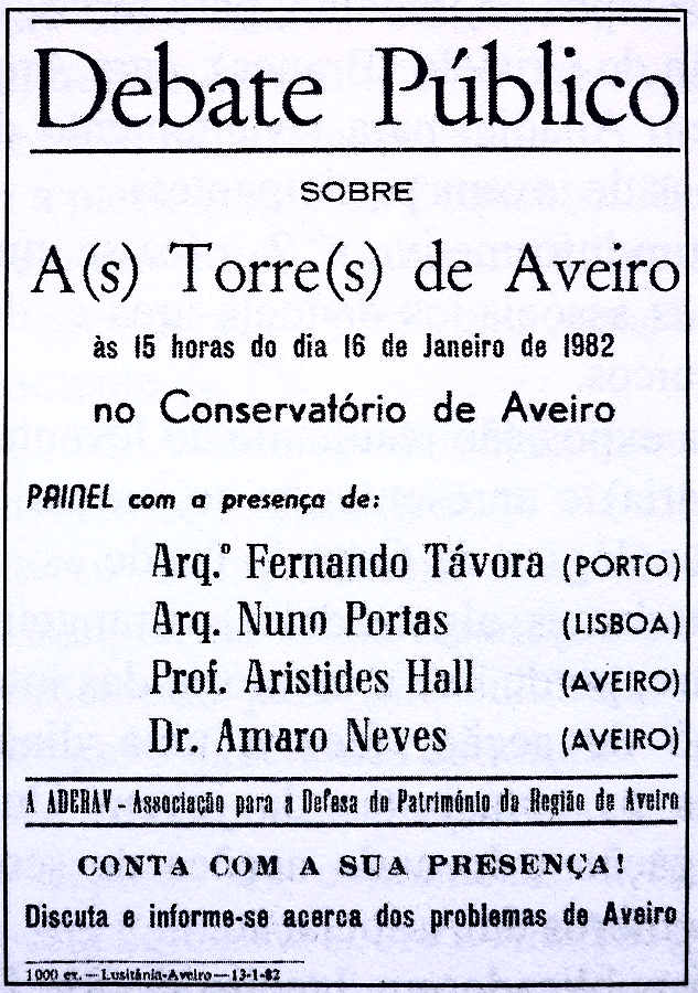 Mas o que mais marcou a actividade deste mandato foi, sem dúvida, um debate aberto à população sobre "A(s) Torre(s) de Aveiro", agendado para 16 de Janeiro de 1982, com a presença dos Arq. Fernando Távora e Nuno Portas, e dos associados Aristides Hall e Amaro Neves, presidindo Renato Araújo. Inicialmente, foi pedido ao Presidente da C.M.A. que este debate tivesse lugar no salão cultural – o que mereceu a sua concordância – mas, na antevéspera, foi subitamente indisponibilizado o dito espaço, obrigando a refazer-se toda a publicidade, para se realizar no Conservatório de Aveiro(19), que estava cheio (Nuno Portas não esteve). O debate foi quente, por vezes escaldante, salientando-se nele a frontalidade e honestidade intelectual do Arq. / 17 / Fernando Távora que, sobre a "torre dos 32 andares" – ele que era pai do projecto! – disse que, decorrido tanto tempo após a concepção da obra no seu conjunto (para o Plano Director de 1964), não havia, nesta altura, razão nenhuma para o sustentar, tanto mais que, se fosse feito agora, apareceria desenquadrado, dado que se não deu cumprimento à obra geral em que a torre se enquadraria, na previsão do Plano Director.