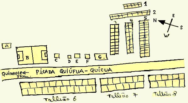 Já dei a minha volta. Já desenhei a planta que vos envio. Vai tudo a rigor. Só me faltou uma fita métrica, para poder elaborar o projecto à escala. Não estive para utilizar a mesma minúcia com que desenhei a planta do Alto Zaza, quando elaborei o plano de defesa. Já convivi com o pessoal e com os furriéis que estão aqui. Os mesmos de sempre? Deveria responder: «claro que sim!» Mas é claro que não. Com a escuridão que faz lá fora e a distância que me separa deles, não os consigo ver daqui. Nem com telescópio! Desta vez, não estou com elementos do meu grupo, mas de outro. Mas nem por isso deixam de ser o meu pessoal, o pessoal que está sob o meu comando e pelo qual sou responsável. Também já dei uns mergulhos no rio, onde aproveitei para me ensaboar com champô e tirar o suor do corpo. E já jantámos.