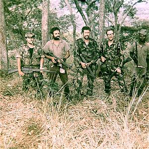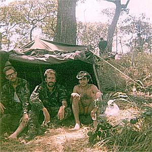 Mais uma fotografia foi disparada, tendo como figurões o furriel Galvão, o Reguengos, o Capitão Alberto e a minha ilustríssima pessoa. Depois da passeata e revista às tropas no meio da mata angolana, regressámos ao recolhimento da tenda. — O que é que o Galvão está a fazer? — perguntei eu. — Vou-me pôr à vontade. Vou-me despir. — O quê? Temos uma sessão de strip-tease na mata? — perguntou o capitão, brincando com o furriel. — Ainda se fosses uma miúda jeitosa... — Olhe que é boa ideia, Galvão! — disse eu. Vou também pôr-me à vontade. Mas não vou tão longe. Vou descalçar-me. Vou tirar as botas e as meias e ficar à vontade. — Também vais fazer strip-tease, Ulisses? — Não, Capitão. Não vou tirar a roupa, à cautela. Não vou tão longe como o furriel. Pode aparecer por aqui alguma abelha que implique comigo. Já me bastou da outra vez, que fiquei com um alto na planta do pé. — Ó Reguengos, tire-nos uma fotografia. — pediu o furriel Galvão. — É para mandar para casa. É para verem que aproveitamos bem os momentos a fazermos campismo no meio das operações na mata.