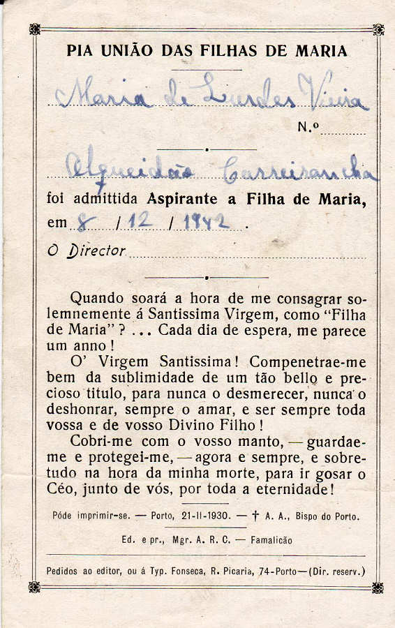 Pagela de Admissão a Aspirante a Filha de Maria de 1924. Dim. 7,5x12 cm.