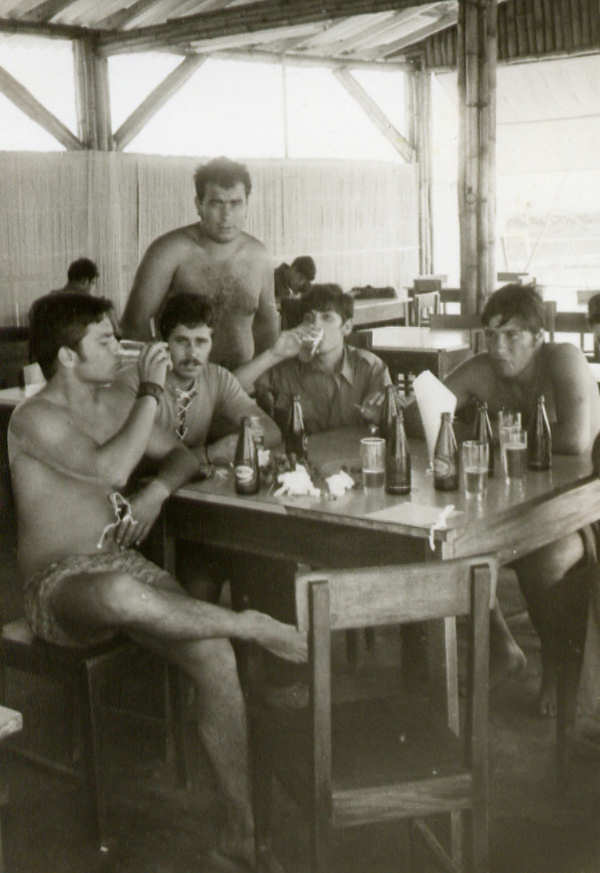 Grupo da Companhia de Caçadores 3437 do Batalhão 3855 a petiscar e a berber umas Cucas no bar "Brinca na Areia". Da esquerda para a direita: ???; ???, ??? e ???.