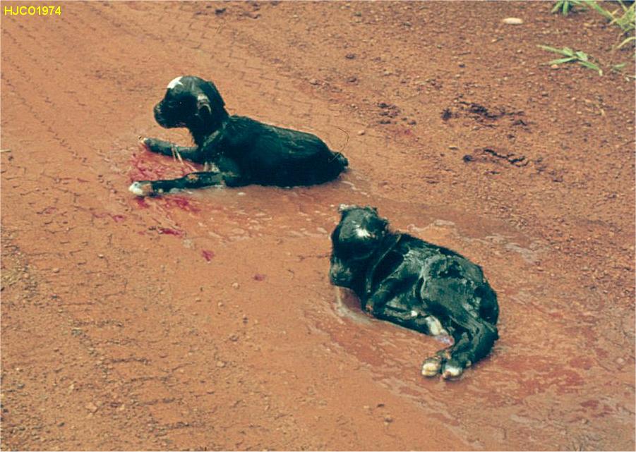 A operação, próximo de Bange Angola, sofreu uma brusca paragem. Uma cabra estava no meio da picada a dar à luz. Ficámos todos em suspenso, sem fazer barulho, à espera que os dois cabritos saíssem. Com eles fora, a cabra levantou-se e fugiu assustada. Henrique J. C. de Oliveira - 10/04/1974. Ficheiro: Bange01.jpg - 108 KB