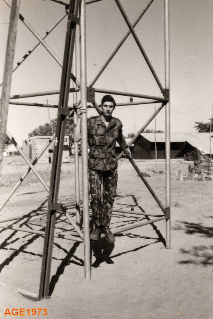 O Autor numa  foto para enviar à família, junto da torre de suporte do depósito de água. Ao fundo as casernas da CCaç.3387.