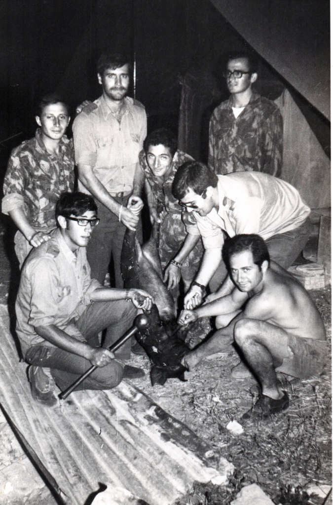 Elementos da Companhia de Caçadores 3387, preparados para uma saída a Pereira d´ Eça. Da esquerda p/ a direita: Coutinho, Sousa (cabo), Araújo, Mendes e Leonel Cardoso.