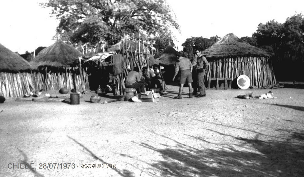 Grupo da C. Caç. 3387 na sua passagem pelo Chiede em 1973. Olhando para o fotógrafo vê-se o condutor do unimogue, o Luciano Rosas Quinta. A deslocação ao «kimbo», isto é, à sanzala teve como objectivo a compra de um «chicombo», ou seja, um cabrito. Ver o DIÁLOGO travado entre os intervenientes: Mário (fotógrafo), o Luciano (condutor), Carlos Alberto Gaiolas Neves (de costas) e os nativos.