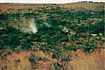 Nuvem de gotículas de água provocada pelos rápidos e Quedas Guilherme, no rio Cuango, entre o Zaire e Angola. Ao longe, uma povoação e base militar zairense.