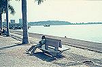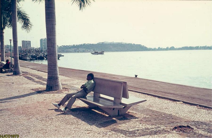 Aspecto da baía de Luanda. Dormindo a sesta num dos bancos existentes na avenida. Ao fundo, os barcos de pesca atracados, quando a lota era situada nesta zona da baía.