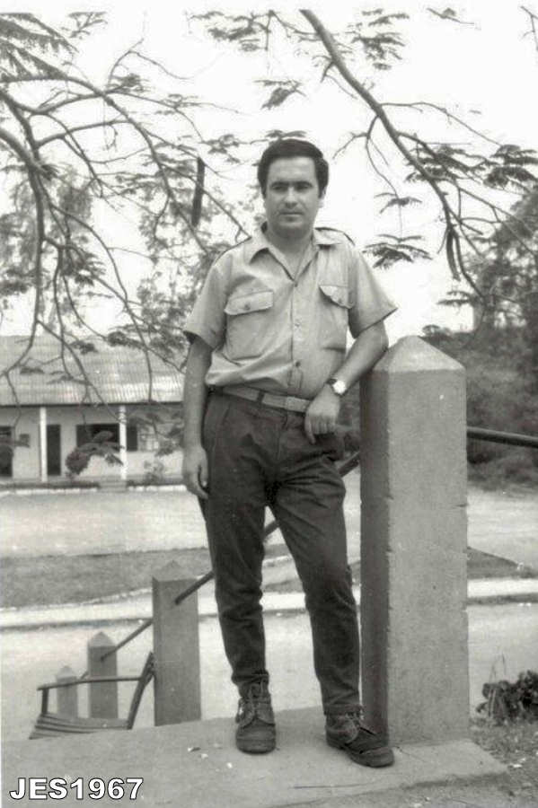 João Evangelista da Silva, elemento da Companhia de Caçadores 1430, na escada que dava acesso da estrada á caserna, durante o segundo trimestre de 1967. João Evangelista da Silva. Ficheiro: 14_Mabubas