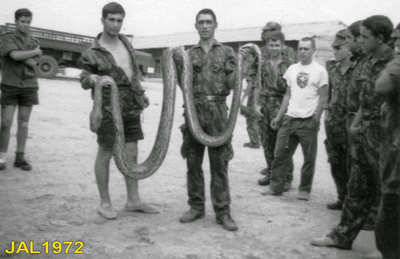 Dois elementos da Companhia de Caçadores 3412 em 1972, com uma enorme jibóia: ??? e ???. John André Lima - 1972