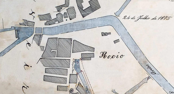49. Neste excerto do mapa de 1904, verificamos que o esteiro do Cojo praticamente desapareceu, e o da Fábrica passou a ter a designação do esteiro desaparecido. Toda a zona compreendida entre os dois esteiros, no século anterior, apresenta agora diversas edificações, muitas das quais irão desaparecer com a abertura da Avenida Central, posteriormente chamada Av. Dr. Lourenço Peixinho. Curiosamente, o mapa apresenta uma zona ajardinada de formato trapezoidal situada entre dois edifícios. Se consultarmos a versão ampliada do mapa, verificamos que, além do jardim, existia um «Campo da Feira dos 28», entre o «Esteiro do Cojo» e a «estrada para a estação» dos caminhos de ferro. Após esta viagem no tempo por meio dos mapas, vejamos o que as imagens antigas nos mostram.