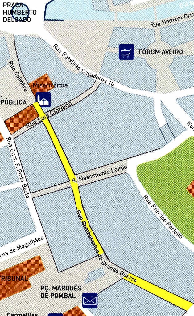 Localização no mapa da Rua Combatentes da Grande Guerra, assinalada a cor amarela. Esta rua, antigamente a Rua Direita, foi cortada pela actual avenida Santa Joana, onde termina.