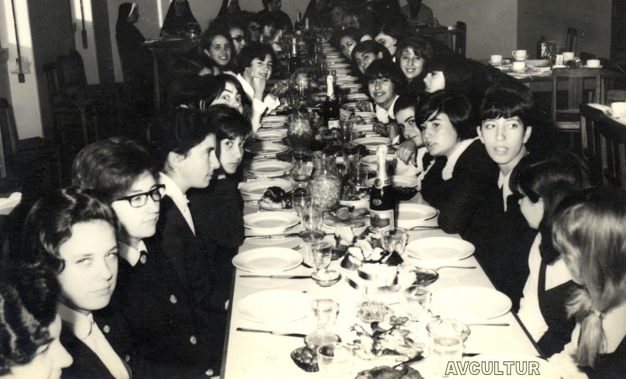 Festa do final de ano lectivo no refeitório. Nomes: 1.???; 2.???; 3.???; 4.???; 5.???; 6.???; 7.???; 8.???; 9.???; 10.???; 11.Celeste; 12.Manuela Moreira Lopes; 13.???; 14.???; 15.???; 16.???.