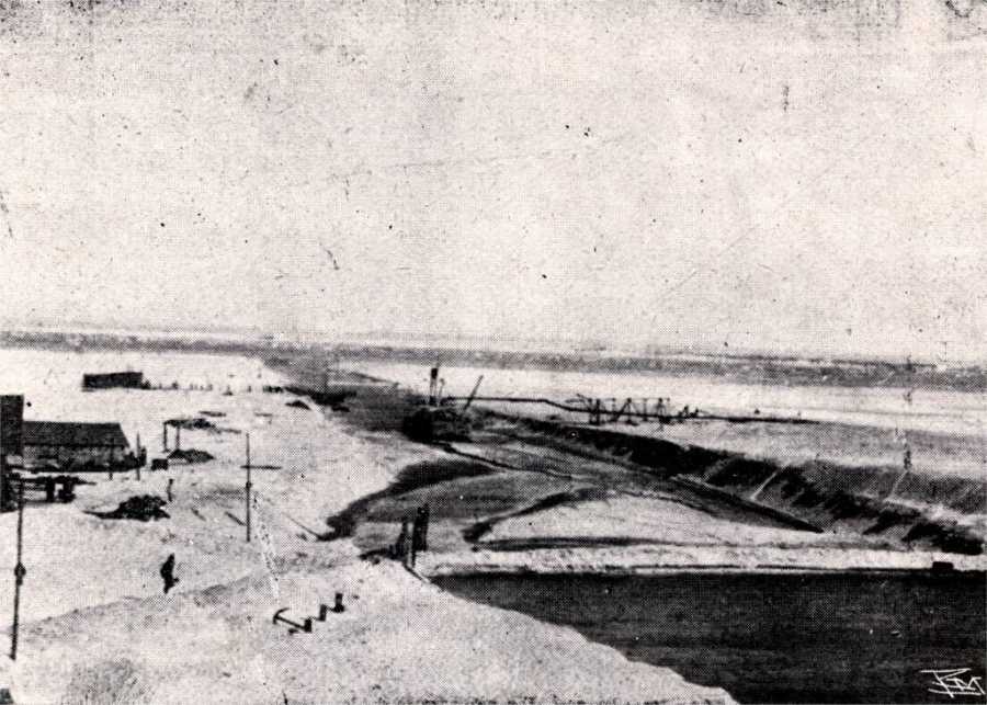 Draga «Mondego» recomeçando o trabalho. Estado em que ficou o canal depois do desastre (vê-se a barreira de protecção). Qual desastre? Ver texto informativo.