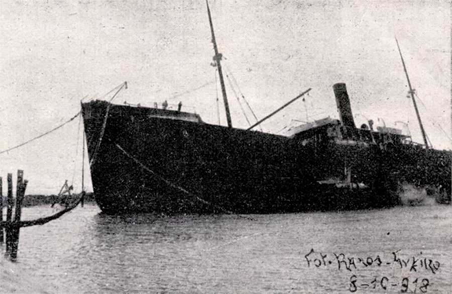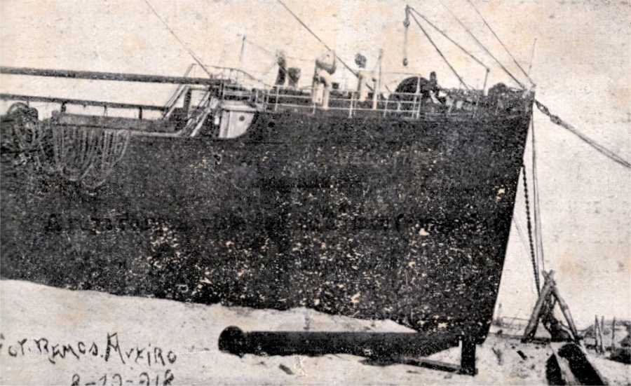O navio já dentro do canal e o «Formiga» fazendo o assoreamento do lado do mar.