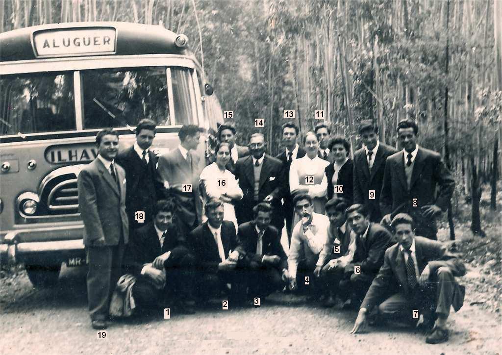 Grupo de finalistas que efectuou um passeio de estudo em 4 de Maio de 1955. A foto foi tirada em frente à Câmara Municipal de Aveiro, tendo por fundo uma das casas existentes antes da construção do edifício do arquitecto Fernando Távora para a Biblioteca, actualmente erradamente desactivado das funções originais.