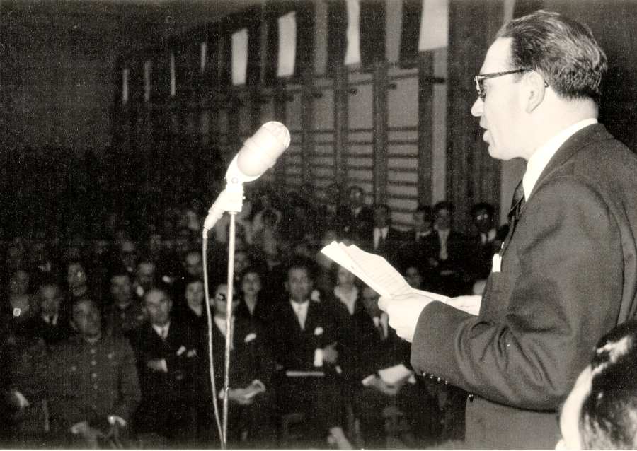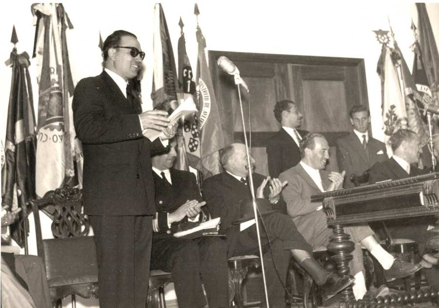 26.Momento em que o Director da Escola, Dr. Amadeu Cachim, proferia o discurso na inauguração das novas instalações da Escola. Estão na mesa o Ministro das Corporações, o Governador Civil, o Presidente da Junta Autónoma e o Capitão do Porto.