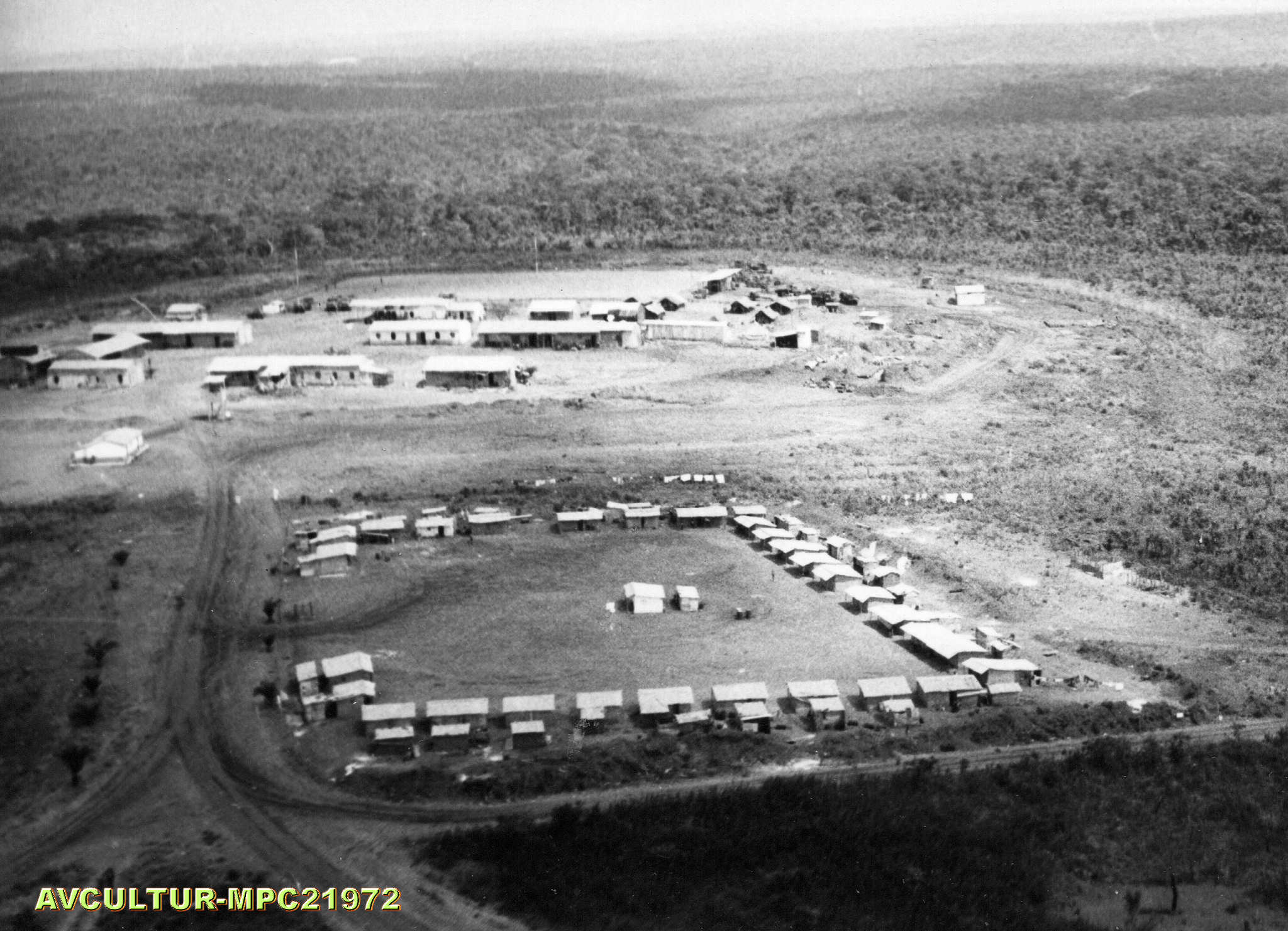 Vista aérea do aquartelamento de Quicua, como ele era em 1972. (Foto em alta resolução). Na metade inferior, a povoação com o mesmo nome.