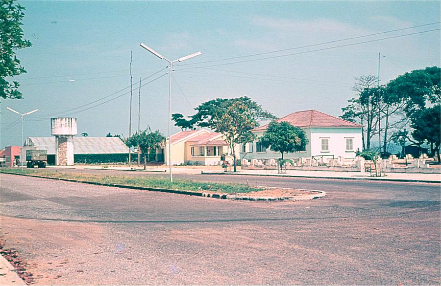 Aspecto da avenida principal de Quimbele, vendo-se os edifícios da messe de oficiais, escola primária e depósito da água. Imagem obtida a partir da casa do administrador. Sector de Uíje - Carmona - Angola.