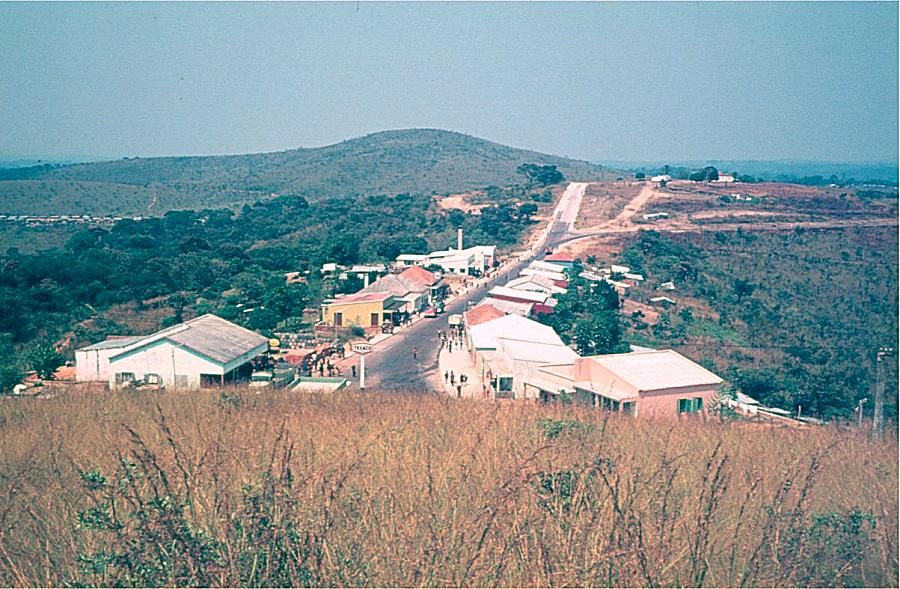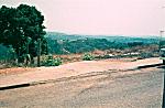 Aspecto da estrada Quimbele-Sanza Pombo, entre o cimo da vila e o hospital, vendo-se na base da colina as moradias com as respectivas casas comerciais. Ao fundo, a colina onde fica o hospital. Sector de Uíje - Angola. Confrontar com imagem antes da asfaltagem.