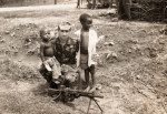 Carlos Neves na companhia de miúdos da sanzala de Quiquiemba. Atente-se no pormenor do objecto trazido por eles. Trata-se da lata com uma pequena asa com que eles habitualmente levavam a ração de comida frequentemente fornecida pelo pessoal militar, após as refeições.
