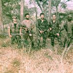 Operação militar na zona do Quitari comandada pelo Cap. Alves da 3ª Companhia do Bat. Caçadores 4511. Sector de Uíje - Carmona - Angola. Da esq. para direita: furriel Galvão, enquadrante Francisco (o Reguengos), Cap. Alves e alferes Oliveira.
