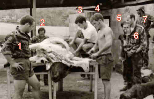 Partida da Companhia de Caçadores 3387 para a Intervenção no Grafanil. Números: 1.Ferraz (malhado); 2.Lourenço (cripto); 3.Firmino; 4.Mário (padeiro); 5.Gaiolas; 6.Orlando; atrás do 7 o Albino; 7.???.