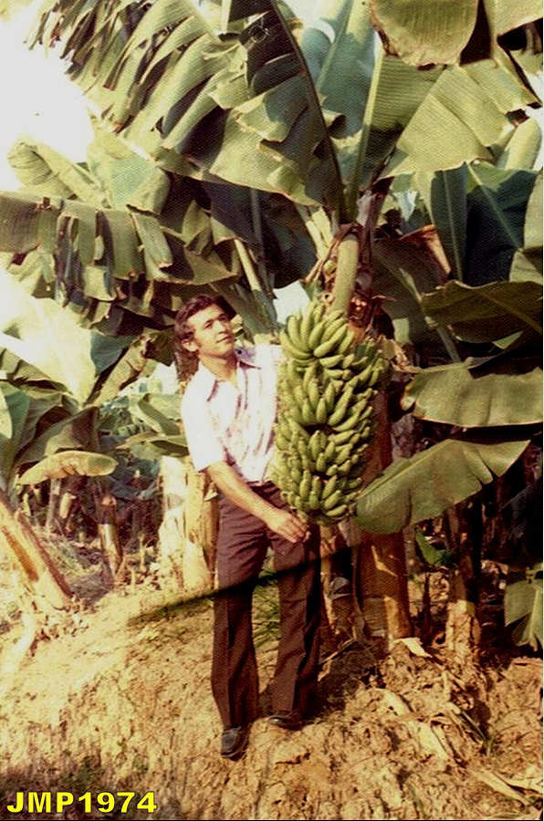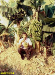 José Monteiro Pinto da 2ª Companhia do Batalhão de Caçadores 4613 na fazenda Tabi com um cacho de bananas.