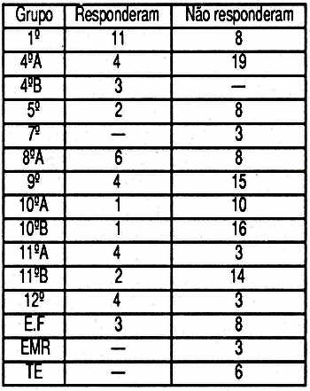 Na página seguinte publicamos um quadro das respostas por itens. Mas agora damos espaço às opiniões da psicóloga escolar que, não concordando com o projecto e não respondendo ao inquérito, escreveu a sua posição: "...que, algumas das modalidades de avaliação aqui apresentadas (...) têm um carácter eminentemente selectivo e normativo, modalidades de avaliação estas que não condizem com um tipo de ensino que promova o desenvolvimento de aluno e que estimule as SUQ.5 capacidades e potencialidades.