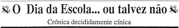 O Dia da Escola é o dia em que não há aulas. "Não há escola", diz-se. E, como o dia é da Escola, o melhor é deixá-la em paz... ao menos uma vez no ano. Não se riscam as paredes, não se pisa relva, não se atiram papéis ao chão, não é preciso proibir e, o melhor de tudo, ninguém chateia ninguém…