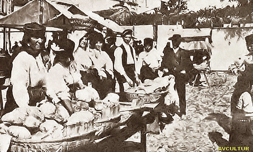 um importante mercado de peixe. Ao fundo da praça, vê-se a avenida que