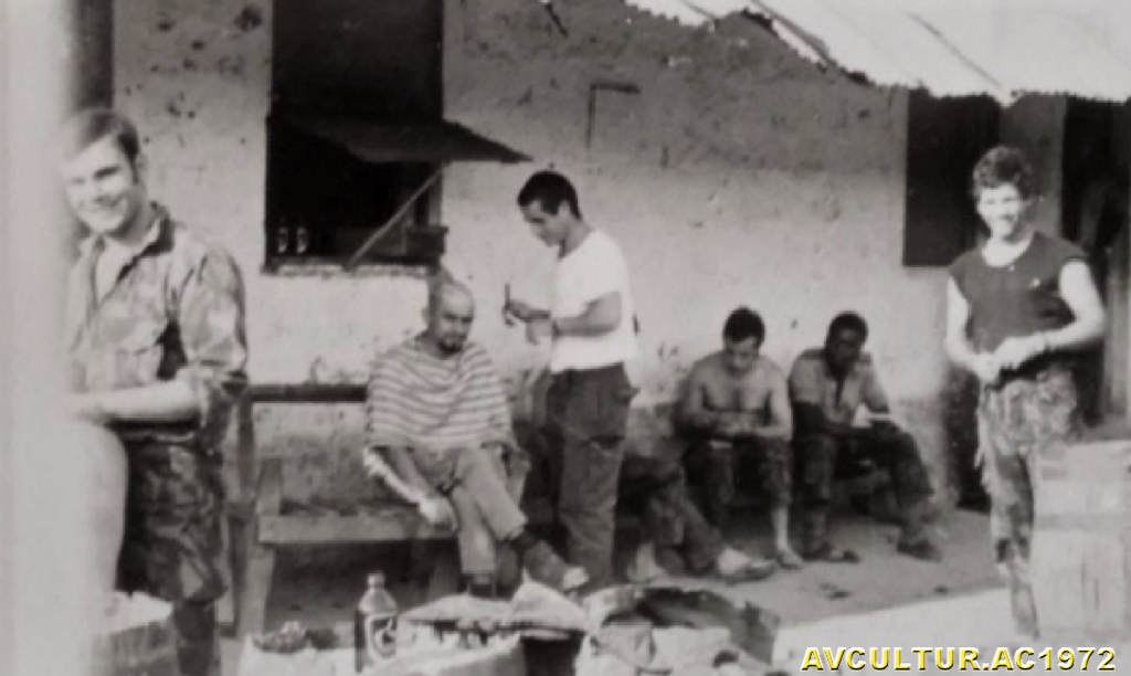Passagem de António Cardoso, o barbeiro da Companhia de Caçadores ????, por Lué. Da esquerda para a direita: ???, ???, ???, ???, ??? e ???.