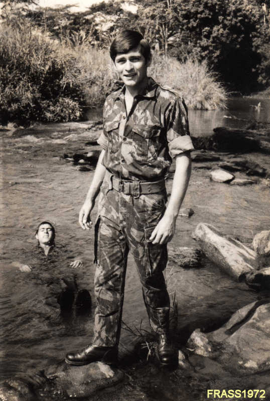 Ricardo A.S.Silva atravessa o rio Lué. Um camarada toma banho vestido e