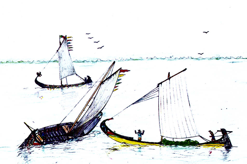 Quase se chocaram e, para espanto dos mestres-camaradas que os conduziam, foi amor à primeira vista! Encostaram-se um ao outro e, ainda que a água estivesse remansosa, sentiram cócegas ao roçarem-se. O Moliceirinho ficou tão contente que até parecia que dava saltos por cima da marola. Retesou a corda de bolinar e desatou numa tão louca velocidade que a Matolinha não o conseguia acompanhar. Como era muito mais leve que os moliceiros de trabalho, fazia-lhes desafios, passando-lhe tangentes pela frente, dava uma volta por detrás deles, mudava de escota e voltava a passar pela frente.