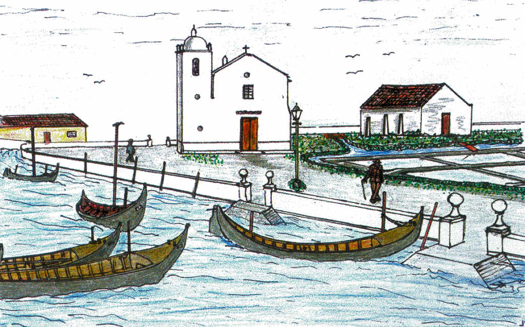 Capela de São João no Rossio de Aveiro e barcos mercantéis há 100 anos.