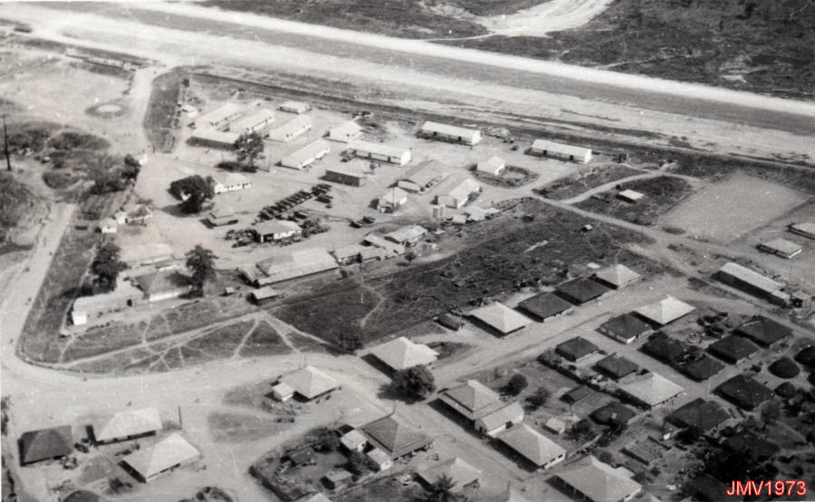 Vista aérea de Aldeia Formosa, no 1º plano. A seguir, o Quartel do Batalhão de  Caçadores  4513 - 3ª Companhia.