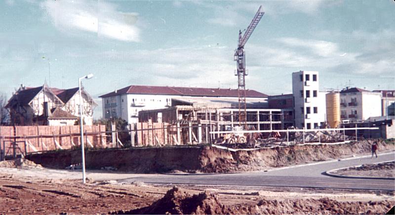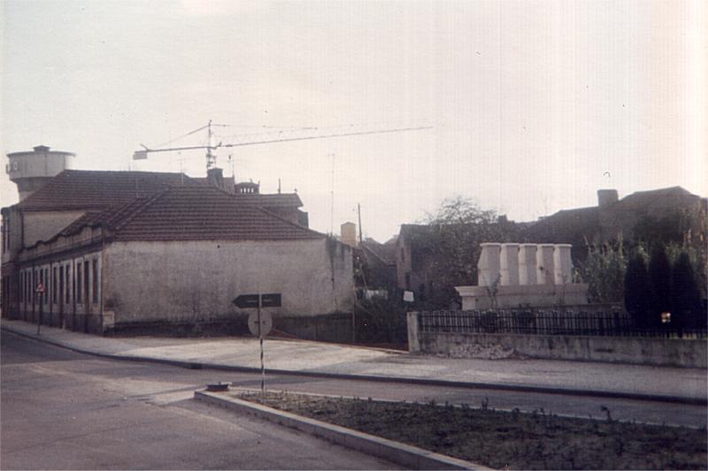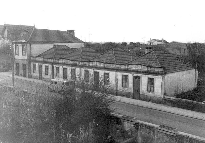 Construção do novo quartel dos Bombeiros Velhos, cuja entrada principal dá para a Rua Dr. Mário Sacramento. À direita, a Estrada das Pombas, vendo-se, ao fundo, o edifício de vários andares na esquina da Avenida Araújo e Silva com a rua Dr. Mário Sacramento.