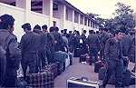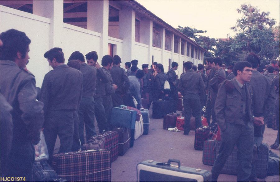 No Regimento de Infantaria 20, em Luanda, a 3ª Companhia do Batalhão de Caçadores 4511 aguarda o embarque na camioneta que a levará ao aeroporto de Luanda, para regresso a Portugal. (Slide refª 1556).