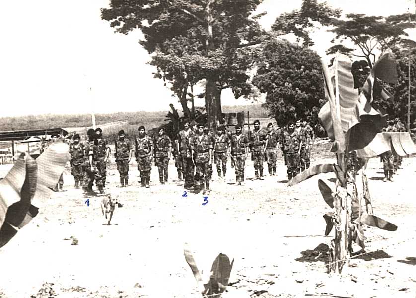 O Chefe do Estado Maior da Armada, Vice-Almirante Ferreira de Almeida, visita Cafine. O Destacamento de Fuzileiros Especiais n.º 12 forma para o receber. Na imagem: 1-Comandte do DFE 12, 1º tenente Mendes da Silva; 2-Almirante F. de Almeida; 3-4º Oficial do DFE, António Vieira.