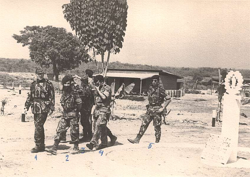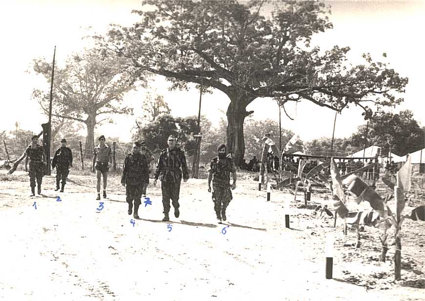 Visita do Governador, General Bettencourt Rodrigues, ao Destacamento de Fuzileiros Especiais N.º 12, em Cafine. Na imagem: 1-Tenente dos Comandos, Guarda-Costa do General; 2-Cap. da Cª do Exército estacionada em Cafine; 3-Governador; 5-Oficial António Vieira; 6-Imediato do DFE 12, 2º Ten. Sanches Baena.     Ficheiro: Cafine09.jpg - 48 KB